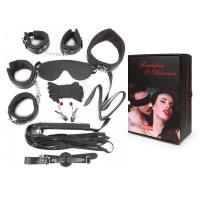 Набор аксессуаров для любителей БДСМ игр. В комплект входят наручники, оковы, ошейник с поводком, верёвка, плётка, кляп, маска, зажимы для сосков.